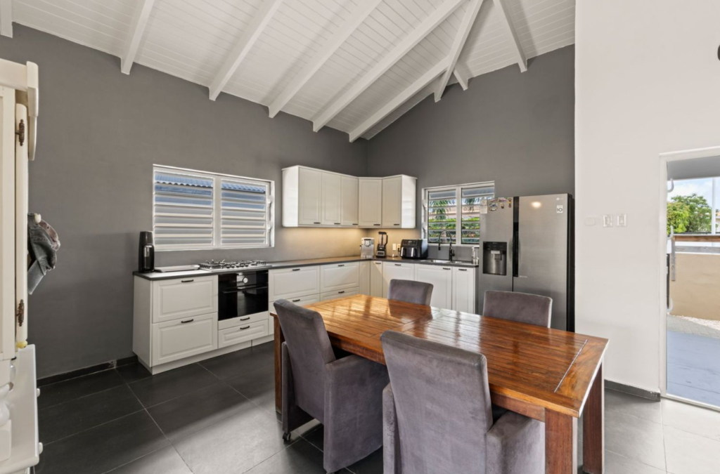 Aan de rechterzijde is een open keuken met inbouwapparatuur.